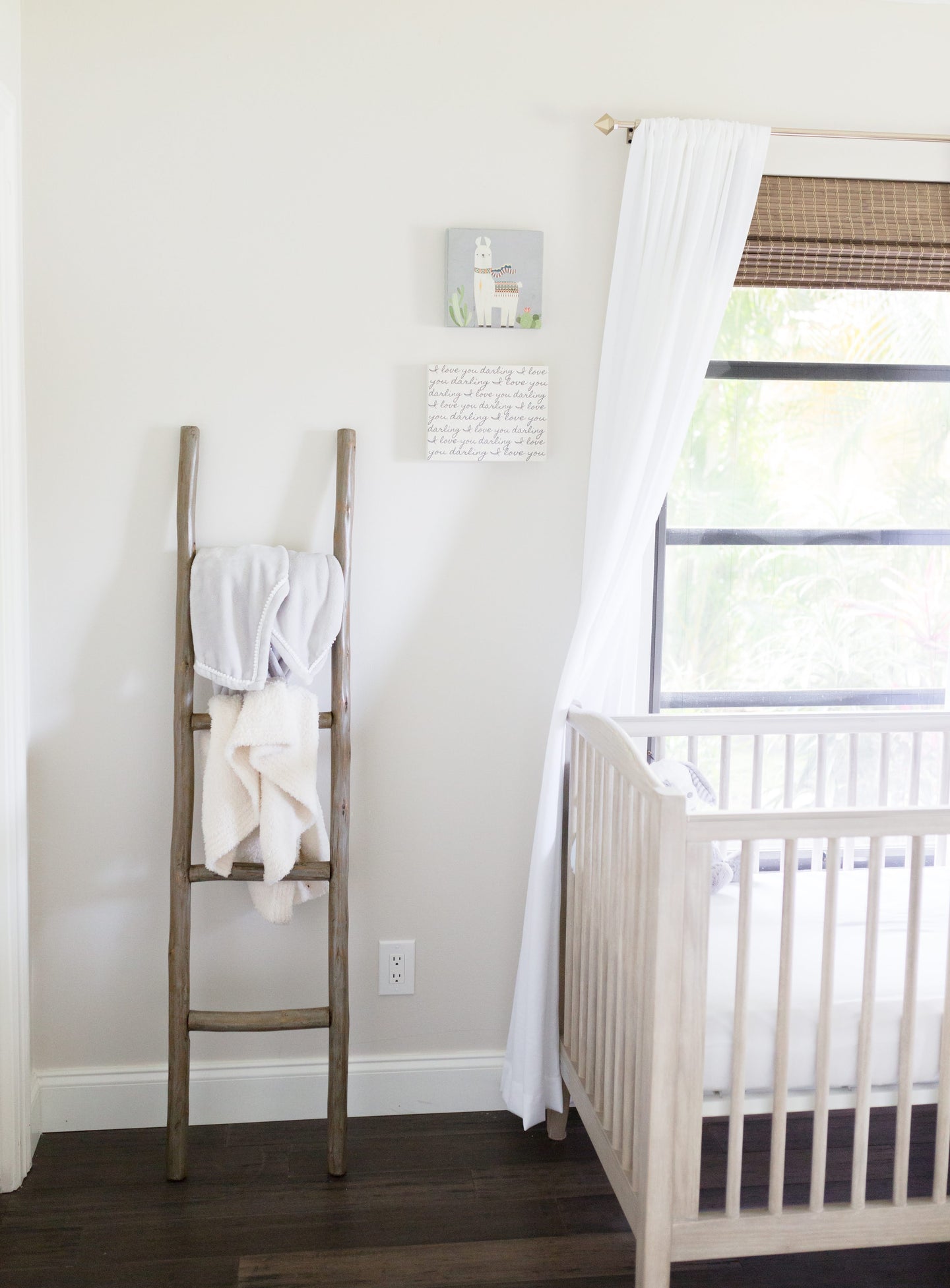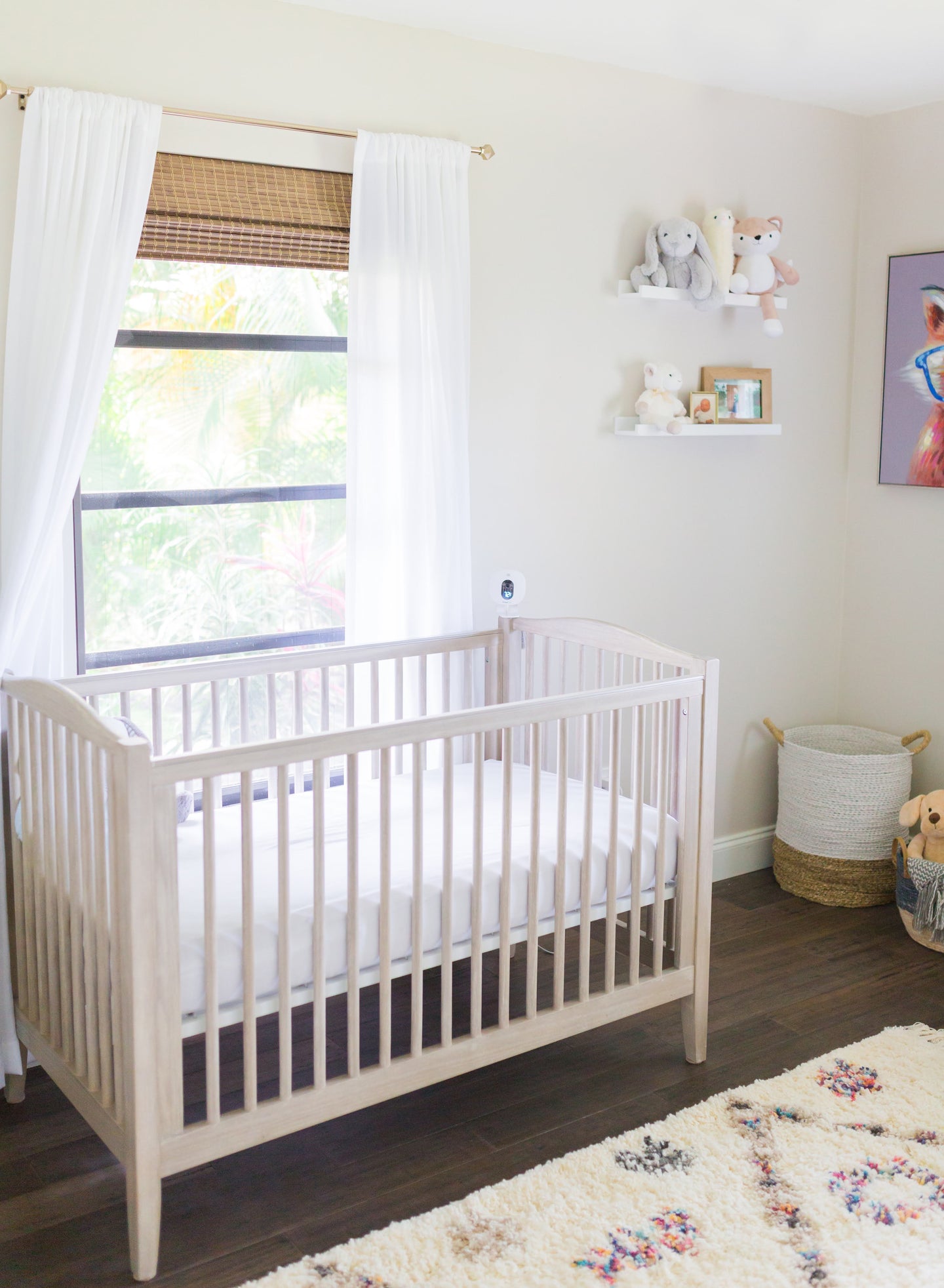 We kept the furnishing aligned with the neutral theme. The baby crib is a light oak, grey-ish finished from Pottery Barn Kids. The dresser and rocking chair are a bright white with warmer accents to tie it all together.