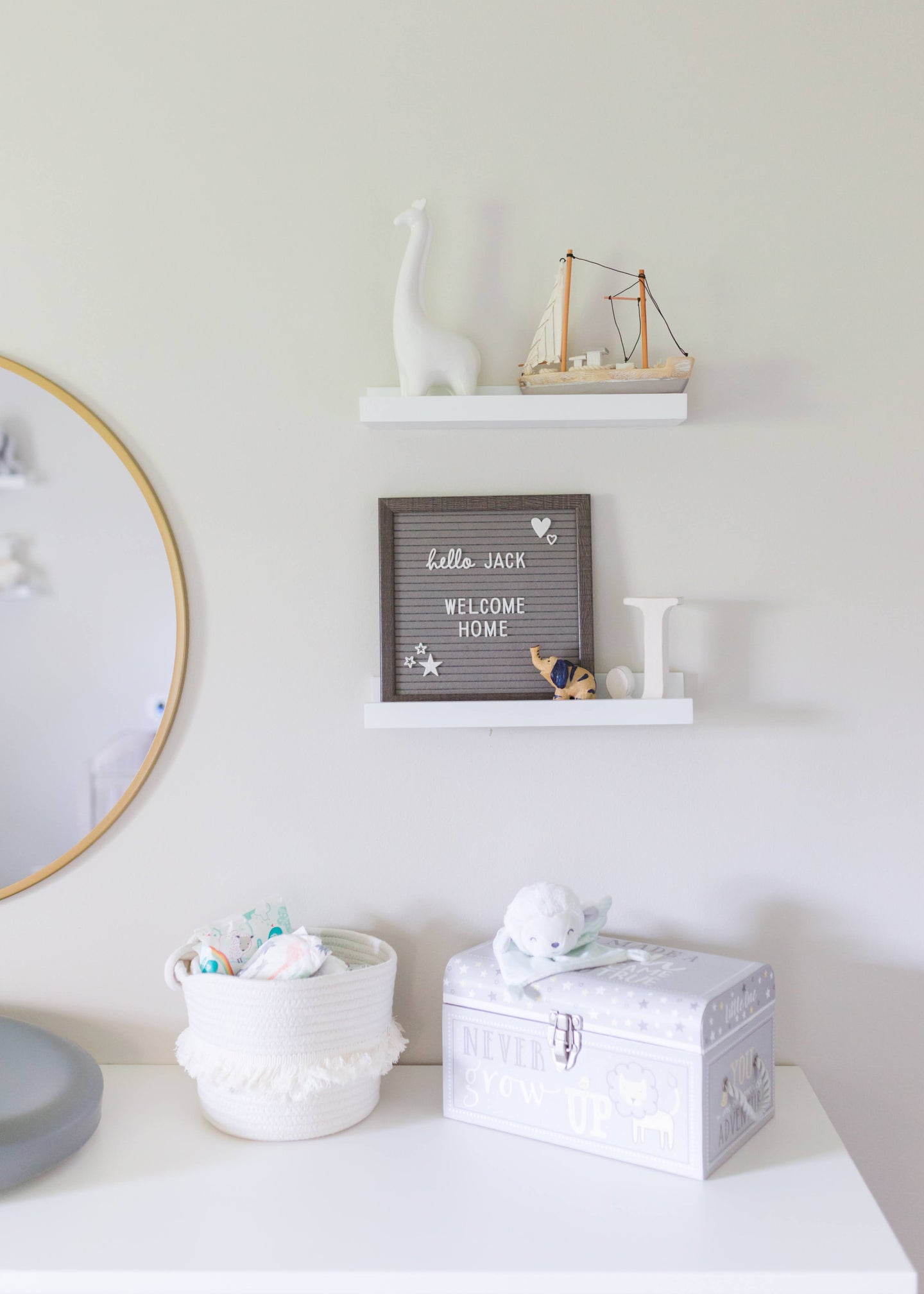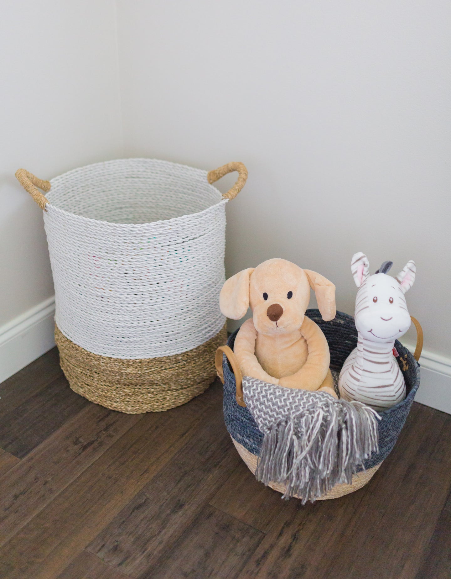 Whether housing soft stuffies or organic diapers, the addition of storage baskets to the space added funtionality and style to the room.